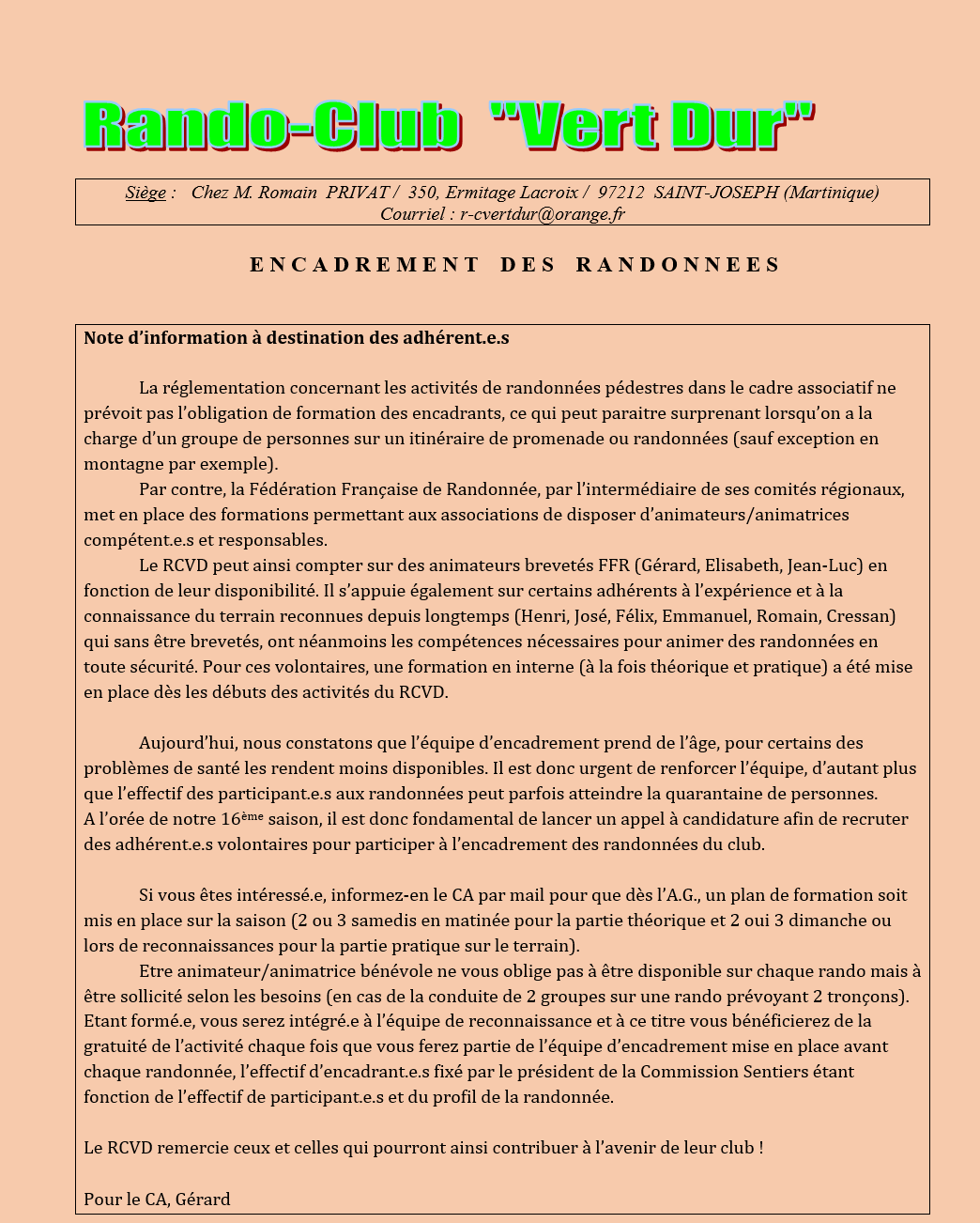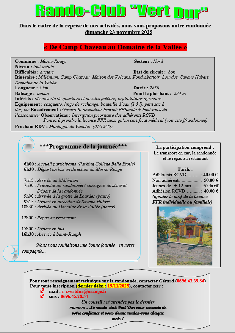 Suivant le voeu émis lors de la préparation du planning de la saison par plusieurs d'entre vous de se rencontrer au restaurant à l'occasion de sorties - celle de Sainte-Marie la saison dernière reste encore dans les mémoires...-, nous vous avons donc concocté un programme qui devrait en satisfaire plus d'un : balade dans les quartiers du Morne-Rouge avec repas au Domaine de la Vallée !
